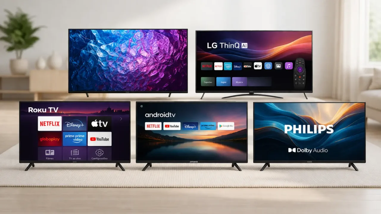 A diferença mais evidente está no sistema e na forma de acesso aos conteúdos. Enquanto a Samsung aposta em processamento de imagem e plataformas de jogos na nuvem, a LG prioriza assistentes digitais e controle por voz. A Roku TV destaca-se pela fluidez no acesso a aplicativos, já a Aiwa combina simplicidade com acesso amplo a apps Android. A Philips oferece uma proposta equilibrada de conectividade e som, focando em navegação intuitiva.
