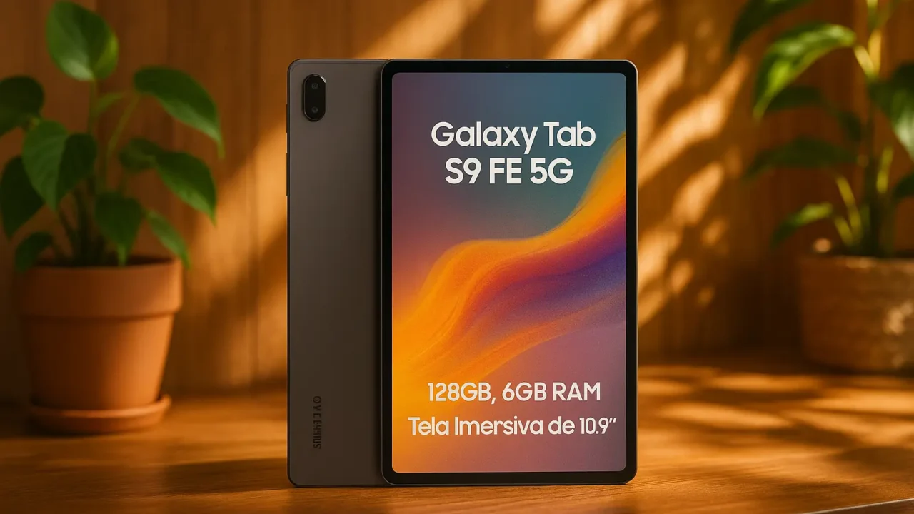 | Galaxy Tab S9 FE (6 GB) | 10.9″ 60 Hz | Design leve, 128 GB, câmeras de 12 MP UW |