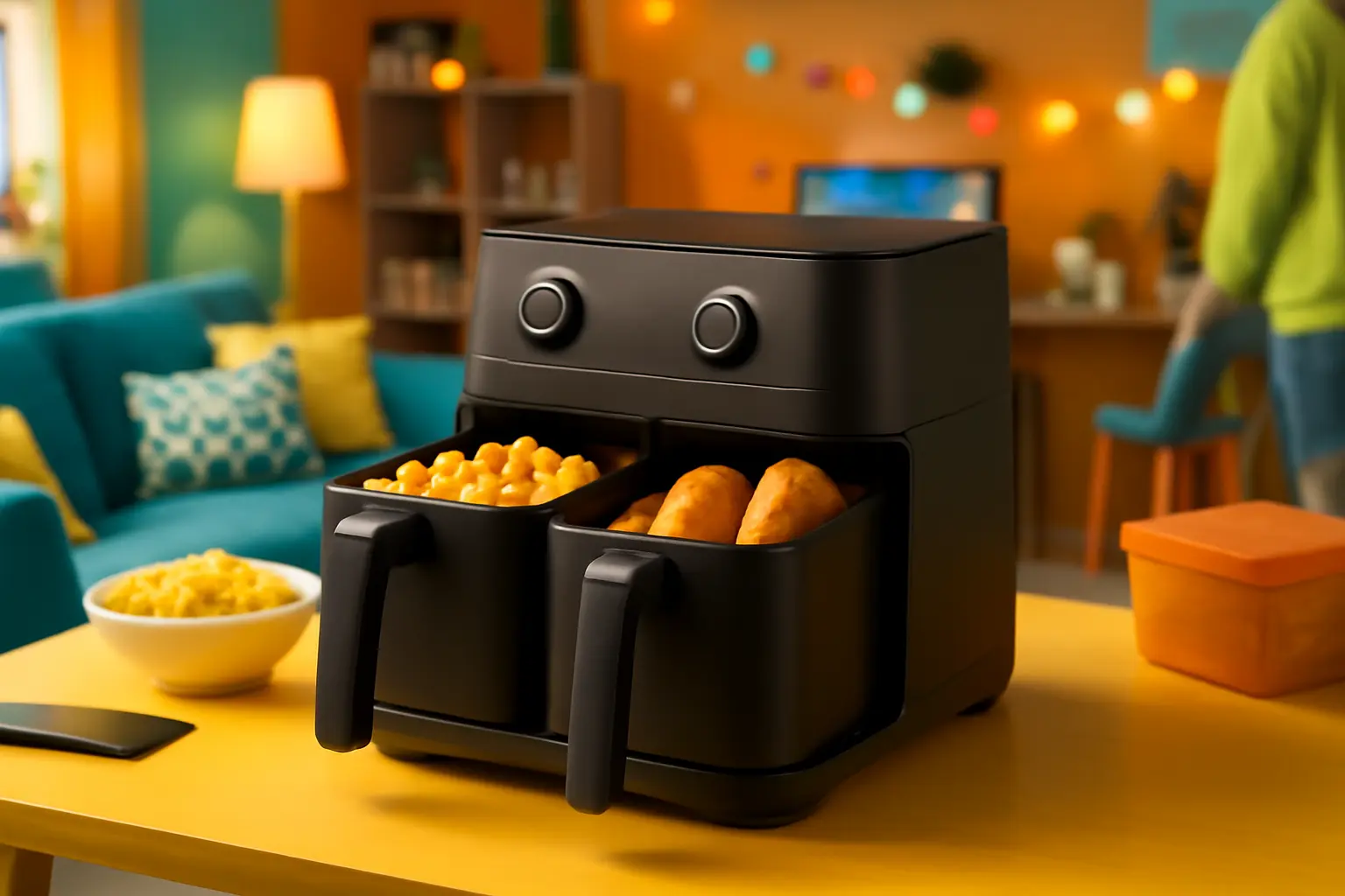 - Função 2 em 1 com duas cestas independentes, permitindo preparar duas refeições simultaneamente.