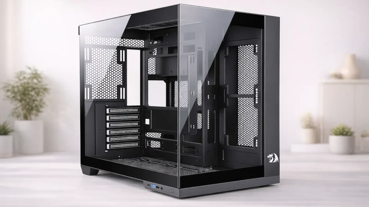 Na prática, gabinete não é só uma peça estética. Ele interfere no espaço que você vai ter para montar, no acesso às portas e até na forma como o conjunto conversa com o restante da mesa. No caso do Redragon Wideload Pro CA-604B-PRO, os sinais mais claros no texto do produto são o formato Mid Tower, o design Aquário e a lateral com vidro panorâmico.